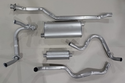 • System contains Y pipe, rear exhaust pipe (our pattern pipe is 2 pcs vs the original 1 pc. long pipe), transverse muffler, tailpipe. Metal-to-metal connection at the manifolds, no gaskets required. Y pipe may be NORS.